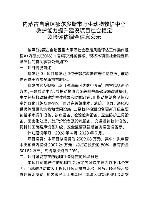 內(nèi)蒙古自治區(qū)鄂爾多斯市野生動物救護中心救護能力提升建設(shè)項目社會穩(wěn)定風險評估調(diào)查信息公示